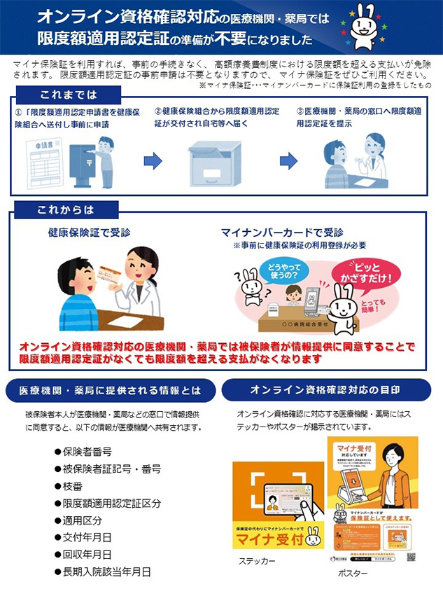 医療機関等で高額な医療費が発生する場合でも、マイナ保険証を使うことで、患者さんが一時的に自己負担したり、限度額適用認定証の書類申請手続きをする必要がなくなります。